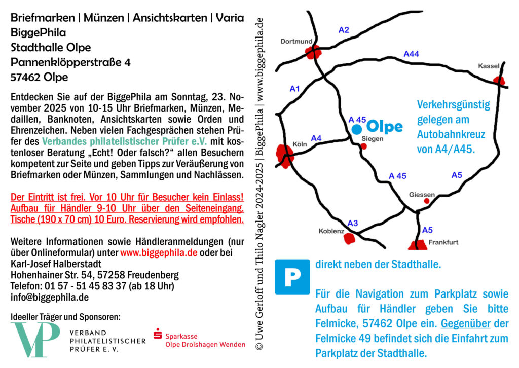 Besondere Bedeutung gewinnt die BiggePhila durch den Informationsstand der Verbandsprüfer des Verbands Philatelistischer Prüfer e.V. zum Thema „Echt! Oder falsch?“. Die Expertise und auch Bewertung von Sammlerstücken sind kostenlos, ebenso die kompetente Beratung zur Veräußerung von Briefmarken, Münzen oder Orden u.a. durch den Siegener Verbandsprüfer Thilo Nagler.
